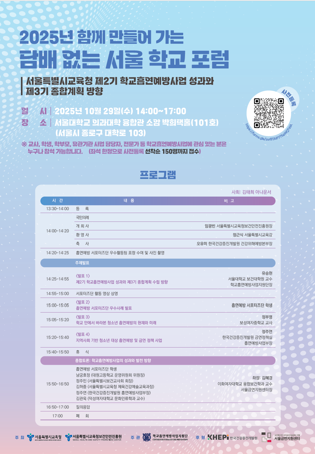 서울특별시교육청, 서울특별시교육청보건안전진흥원, 학교흡연예방사업지원단은 오는 10월 29일(수) ‘2025년 함께 만들어 가는 담배 없는 서울 학교 포럼’을 개최합니다. 주제는 제2기 학교흡연예방사업 성과와 제3기 종합계획 방향‘이며, 관심 있는 분의 많은 참여와 홍보 협조를 부탁드립니다. ● 행사명: 2025년 함께 만들어 가는 담배 없는 서울 학교 포럼 (부제: 서울특별시교육청 제2기 학교흡연예방사업 성과와 제3기 종합계획 방향) ● 일시: 2025. 10. 29.(수) 14:00~17:00 ● 장소: 서울대학교 의과대학 융합관 소암 박희택홀(101호) (서울시 종로구 대학로 103) ● 대상: 교사, 학생, 학부모, 유관기관 사업 담당자, 전문가 등 ● 주최: 서울특별시교육청, 서울특별시교육청보건안전진흥원 ● 주관: 서울특별시교육청 학교흡연예방사업지원단(서울대학교) ● 후원: 한국건강증진개발원, 서울금연지원센터 ● 프로그램 (*세부일정 포스터 참고) ● 사전등록: 포스터 QR 또는 https://forms.gle/zurBTAiP7TKeWQTWA - 좌석 한정으로 사전등록 선착순 150명까지 접수 - 행사 전 사전등록자 확인 문자 발송 예정 ⋇ 본 행사는 현장 참석으로만 진행됩니다. 온라인 생중계는 제공되지 않으니 참석을 원하시는 분께서는 사전 등록해 주시기 바랍니다. ● 문의 - 학교흡연예방사업지원단 (☎02-741-0831, sstf2020@gmail.com)