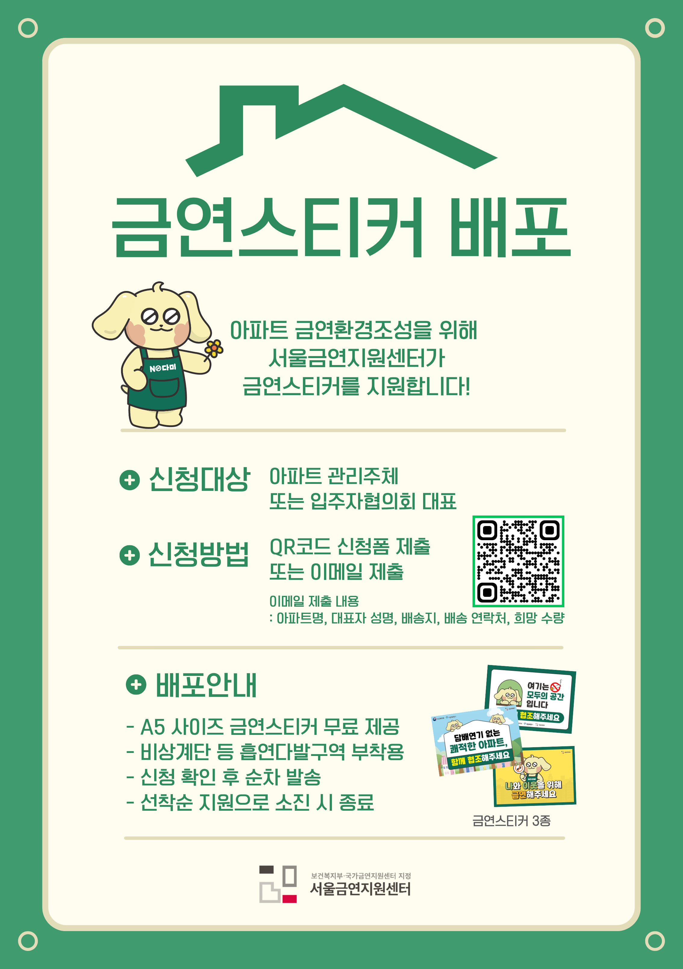 서울금연지원센터에서 공동주택 내 간접흡연 피해를 예방하고 금연문화를 조성하고자 금연스티커를 지원합니다.